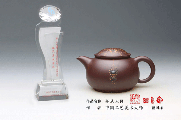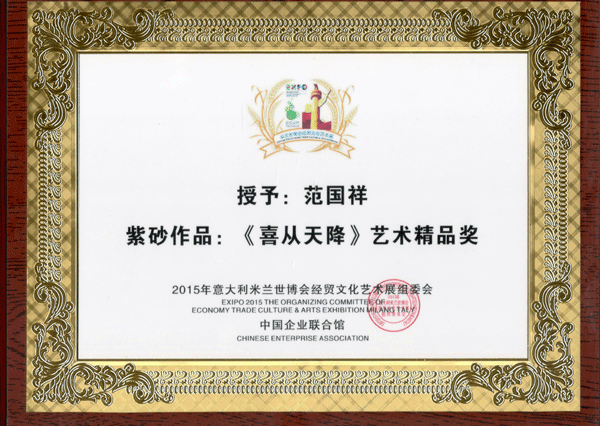 紫砂作品《喜從天降》榮獲第二十七屆中國北京國際禮品工藝品展覽會的工藝美術金獎。榮得中國國家級工藝美術大師終身成就獎。