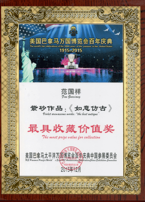 分別榮獲第九屆江蘇省和國家級《德藝雙馨》中國文藝展示活動總評選的“優(yōu)秀指導老師獎”。 2013年范國祥大師與國畫大師徐培晨全國首創(chuàng)合作的五福靈猴套壺被南京博物館永久性收藏。