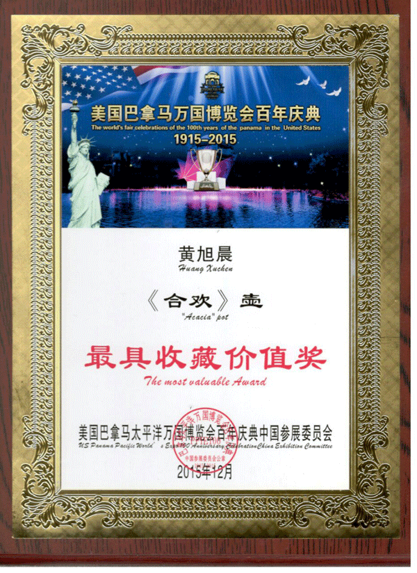 作品葵龍紋合歡壺榮獲2015年美國巴拿馬萬國博覽會百年慶典巴拿馬最具收藏價值獎