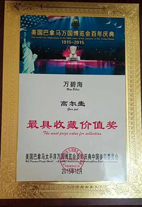 2015年12月14日新創(chuàng)《高爾壺》在北京政協(xié)禮堂榮獲美國巴拿馬“最具收藏價(jià)值獎(jiǎng)”