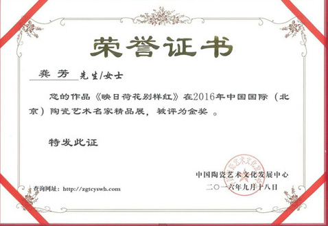 經(jīng)過十幾年歲月的積淀,龔芳的作品已頗有名氣,在各種評比中屢獲大獎。作品《映日荷花別樣紅》申請參加 2016年中國國際(北京)陶瓷藝術(shù)名家精品展作品評比“金獎”。