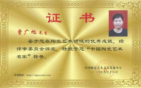 個(gè)人簡介: 曾廣旭,男,1971年出生于徳化。國家級(jí)高級(jí)工藝美術(shù)師、中國陶瓷藝術(shù)名家、中國陶瓷藝術(shù)文化發(fā)展中心會(huì)員。