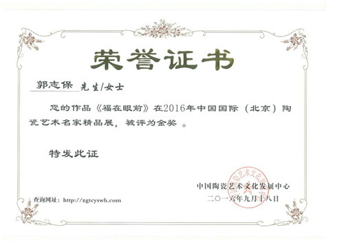 2016年經(jīng)中國(guó)陶瓷藝術(shù)文化發(fā)展中心評(píng)審委員會(huì)評(píng)定為“中國(guó)陶瓷藝術(shù)家”。