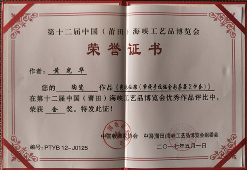 2017第十二屆中國(莆田)海峽工藝品博覽會(huì)柴燒陶瓷作品“密林仙蹤”獲金獎(jiǎng)
