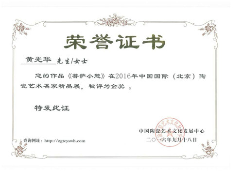 2016年9月中國國際(北京)陶瓷藝術(shù)名家精品展陶瓷作品“菩薩小憩”獲金獎(jiǎng)