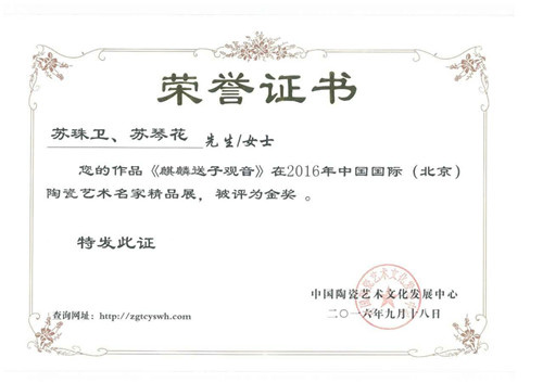 作品《立蓮楊柳觀音》參加第二屆北京(國際)陶瓷藝術(shù)名家作品展評(píng)比榮獲“特別金獎(jiǎng)”