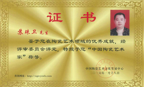 2016年經(jīng)中國陶瓷藝術(shù)文化發(fā)展中心評(píng)審委員會(huì)評(píng)定為“中國陶瓷藝術(shù)家”。