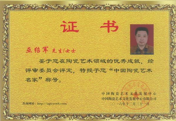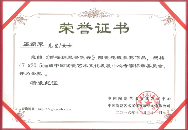 作品《群峰擁翠景色好》被中國(guó)陶瓷藝術(shù)文化發(fā)展中心專(zhuān)業(yè)評(píng)審委評(píng)為“金獎(jiǎng)”。2016年經(jīng)中國(guó)陶瓷藝術(shù)文化發(fā)展中心評(píng)審委員會(huì)評(píng)定為“中國(guó)陶瓷藝術(shù)名家”。