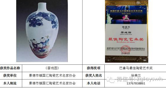 作品細膩蘊含古樸與淡雅,大氣中透,清秀,其代表作《富貴吉祥》,《山水》等作品多次獲獎及省市博物館收藏,被譽為最具收藏潛力的青年女畫家。 作品《嬰戲圖》榮獲2015年美國巴拿馬萬國博覽會百年慶典(1915--2015)最佳陶瓷藝術獎。 作品《富貴吉祥》榮獲2016年中國國際(北京)陶瓷藝術名家精品展經中國陶瓷藝術文化發(fā)展中心評審委員會評定為“金獎”。 2016年經中國陶瓷藝術文化發(fā)展中心評審委員會評定為“中國青年陶瓷藝術家”。