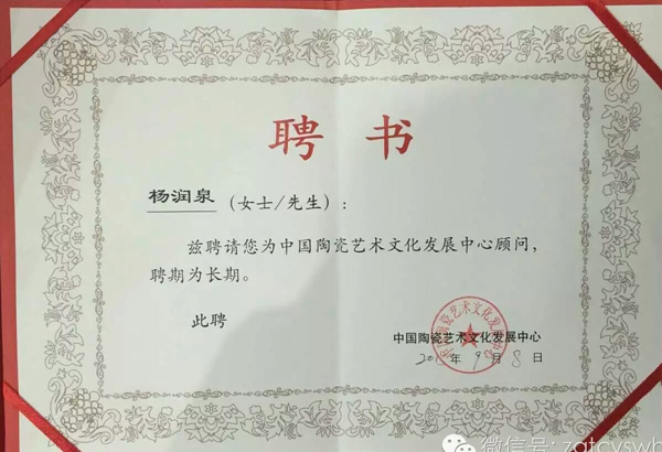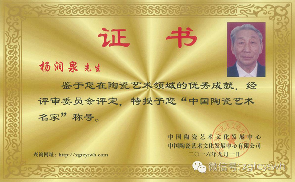 陶瓷書法作品作為國禮被泰國、韓國領(lǐng)導人收藏。 2013年,中國綜藝文化周--“瓷都珠山杯”全國書畫和陶瓷藝術(shù)品聯(lián)展賽活動,《中國夢》瓷瓶獲“特別金獎”。 2013年中華人民共和國文化部、全國人民對外友好協(xié)會授予“中國陶瓷文化藝術(shù)大師”稱號。 2015年經(jīng)中國陶瓷藝術(shù)文化發(fā)展中心評審委員會和江西省工藝美術(shù)學會共同評定為“中國陶瓷藝術(shù)名家”。 續(xù)2015年茲聘請楊潤泉為中國陶瓷藝術(shù)文化發(fā)展中心顧