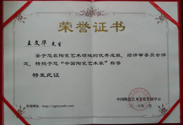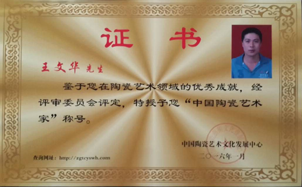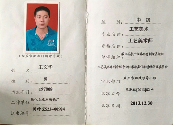 個人簡歷 王文華:男,工藝美術師,中國陶瓷藝術家,德化陶藝柴燒協(xié)會會員從事陶瓷行業(yè)20多年,師從福建省工藝美術大師林建勝。2012年5月至9月在泉州市工藝美術學院美術培訓班進修學習。2013年2月至2016年1月在江西省景德鎮(zhèn)陶瓷學院完成全部課程。2011年6月27日創(chuàng)辦了德化縣鴻杰陶瓷廠,德化陶藝柴燒協(xié)會會員 。