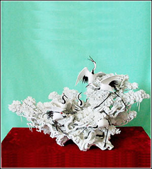 夸張簡潔,神態(tài)悠揚,色澤明朗,既有傳統(tǒng)瓷雕的吉祥寓意,又有時代趣味。