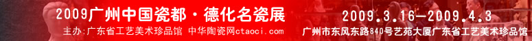3月16日,2009廣州中國(guó)瓷都德化名家名瓷精品展,正式開(kāi)幕,地處廣州市東風(fēng)東路840號(hào)藝苑大廈省工藝美術(shù)珍品館。此次展覽將持續(xù)到4月3日,系由廣東省工藝美術(shù)珍寶館與中華陶瓷網(wǎng)聯(lián)合舉辦。 來(lái)自20多位省級(jí)、國(guó)家級(jí)工藝美術(shù)大師的200多件德化名家精品瓷精彩亮相,一展德化陶瓷風(fēng)采。 ...[更多簡(jiǎn)介] |