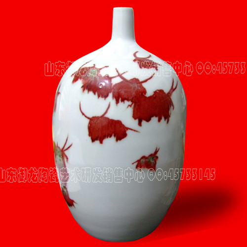 拉坯手繪釉里紅——紅牛瓶  特點(diǎn):1.肚圓充盈,首口高聳,上下串通,神氣膘豐。2.釉色瑩潤(rùn),紅中泛綠,融合之相。角碩體壯,宏發(fā)之兆。用途:1.作裝飾瓶,造型簡(jiǎn)潔流暢,形象張揚(yáng)生動(dòng)。靜中寓動(dòng)。2.作燈座,以穩(wěn)健之紅光碩牛為基礎(chǔ),穩(wěn)重有內(nèi)涵,外形內(nèi)寓,渾然天成。