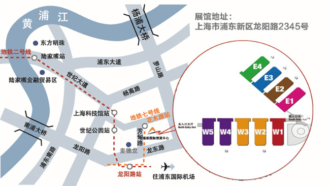 2號(hào)線龍陽路站4號(hào)口出站乘班車到達(dá)展館