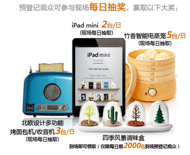 每日前2000名到場(chǎng)預(yù)登記觀眾,可獲價(jià)值“四季風(fēng)景調(diào)盒”1套,并有機(jī)會(huì)參與現(xiàn)場(chǎng)抽獎(jiǎng),贏取Ipad Mini以及更多時(shí)尚家用產(chǎn)品(見右圖)。