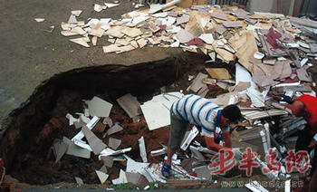 7月3日上午9時(shí)許,膠南市瑯琊臺(tái)路南端突然發(fā)生公路塌方事件,形成的大坑將馬路邊一家陶瓷專賣店價(jià)值近萬元的瓷磚“吞掉”。記者在現(xiàn)場(chǎng)看到,塌下的大坑深5米,長(zhǎng)8米,寬有4米,里面填滿了破碎的瓷磚。據(jù)介紹,塌方處的公路下面有管道,沙土比較松軟,上面長(zhǎng)期放置著大量瓷磚形成壓力,再加上近期連降大雨,因此造成塌方。
