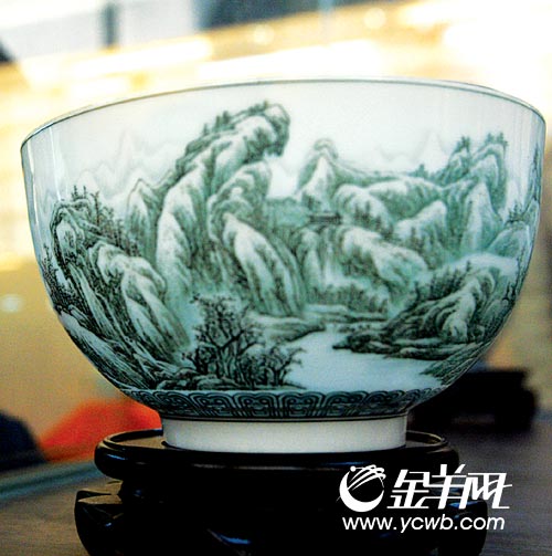 昨天,醴陵釉下彩的極品之作———薄胎碗《雪霽》亮相廣州圖書館。在這件國寶級的醴陵釉下彩作品上,高山流水、山間人家被描繪得惟妙惟肖,從工藝和藝術水平上都可稱是醴陵釉下彩 的巔峰之作。據主辦方大唐陶瓷文化傳播公司的負責人唐斌介紹說,這次展覽中還有上世紀70年代曾作為國家領導人贈送給日本天皇的禮品———六鶴同春雙肩瓶、上世紀70年代醴陵制作的毛澤東專用瓷器“勝利杯”。新快報記者 陳昆侖/攝