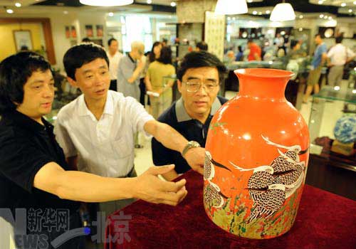 6月28日,觀眾在北京合璧興陶瓷藝術(shù)館參觀景德鎮(zhèn)陶瓷學(xué)院教授的藝術(shù)作品。景德鎮(zhèn)陶瓷學(xué)院教授在展覽現(xiàn)場向陶瓷藝術(shù)愛好者和收藏者介紹青花、粉彩等陶瓷藝術(shù)專業(yè)知識,傳授陶瓷作品鑒賞方法。