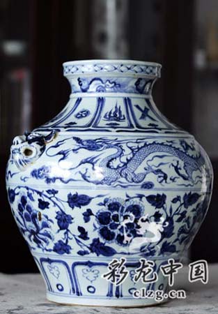 罐子高37.5cm、口徑15.10cm、底徑18.80cm,有口、頸、肩、腹、足,罐子兩端還有用于穿繩子的虎頭,寓意霸氣,罐形比2005年在倫敦佳士得拍賣會(huì)拍得2.3億元的“元青花鬼谷下山圖罐”還勝一籌。