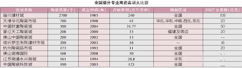 據(jù)調(diào)查結(jié)果顯示,全國成規(guī)模的陶瓷專業(yè)賣場(chǎng)少之又少,華東地區(qū)市場(chǎng)份額大,其中最專業(yè)的非山東莫屬。山東的淄博就有3個(gè)專業(yè)陶瓷賣場(chǎng),分別是淄川建材城、中國財(cái)富陶瓷城和中國陶瓷科技城,三者囊括了山東全省80%以上的陶瓷商戶。2008年,這三大賣場(chǎng)也動(dòng)作頻繁,淄川建材城作為全國最大的建材衛(wèi)浴產(chǎn)品集散地,在第二屆中國(淄川)瓷磚衛(wèi)浴商品交易會(huì)上,以3.6億元的交易額讓業(yè)界刮目相看。而中國財(cái)富陶瓷城更是在9月舉行的峰會(huì)論壇上,以8億元的交易額凸顯了自己的實(shí)力。