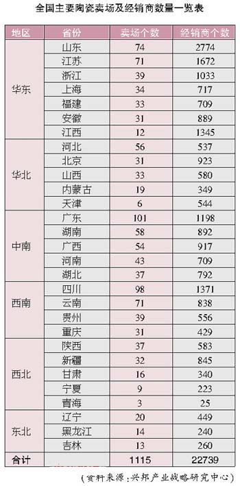 本報(bào)調(diào)查數(shù)據(jù)顯示,中南地區(qū)的陶瓷賣場(chǎng)數(shù)量占到全國的26%,經(jīng)銷商數(shù)量則占到20%,以廣東和湖南、廣西領(lǐng)先。
