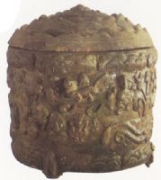 泥質(zhì)陶。子母口,直腹,平底,三獸足,蓋為變形博山式。腹壁滿飾各種浮雕,有神活故事如神仙仕女、玉兔搗藥、西王母、鬼怪、武士、宴樂等,還有珍禽瑞默如翼馬、蟾蜍、羊、豬、蛇、鳥、狐等,器施黃釉。