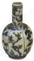 直口,直頸,溜肩,瓜棱腹,淺圈足。圈足內(nèi)有“大清雍正年製”雙行楷書(shū)雙圈款。通體以淡描青花勾出紋飾輪廓線,再填以黃色,紅色,綠色彩料,紅色油嫩,綠色似水般瑩亮明澈。