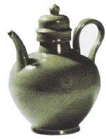 直口,長頸,豐肩,圓腹,矮圈足外撇,肩部一側(cè)飾直流微曲稍低於子口,另一側(cè)置條狀雙帶式把手。蓋為母口,蓋頂劃弦紋三道,葫蘆形鈕,蓋壁有兩孔用以穿繩繫蓋;野滋,通體施釉,釉色青綠。