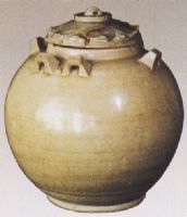 直口、短頸、雙肩、圓腹、餅形足,肩附六橋形繁。胎賞堅(jiān)硬,胎色潔白。器身施釉不到底,釉色青中閃黃,有細(xì)碎開片,釉面晶瑩明亮。南北朝時(shí)期,北方青瓷製造尚處於初級(jí)階段,有山柬的寨里窰等窯燒造。瓷罐造型規(guī)整,製作精細(xì),作為北方青瓷的一件典型器,無疑是研究北朝青瓷的重要資料。