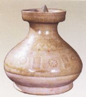 盤口,束頸,扁圓腹,平底。頸部飾蓮瓣紋一周,腹部為蓮花圖案輿豎條相同排列。器附尖頂蓋。器施青釉,釉面光潤(rùn),開(kāi)冰裂紋。此器造型典雅端莊,紋飾簡(jiǎn)潔素雅,墓葬出土,器形較小,保存完好,但較為少見(jiàn)。