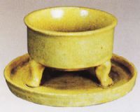 淺圓托盤,內(nèi)置筒形三足爐。內(nèi)外施釉,釉面均凈,開冰裂紋。整體造型規(guī)整,線條簡(jiǎn)潔,流惕,施釉均勻,為南朝時(shí)期較典型的爐式,可作為斷代的標(biāo)準(zhǔn)器。部分釉面脫落。