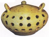 器腹、器底滿佈排列有序的圓形鏤孔。此器出土時內(nèi)裝杯、碟等器。經(jīng)此分析,此器可能為消毒器皿。使用時將杯、碟等器放置其中在沸水中浸泡,提起後水從鏤孔中流出,以達到消毒作用。此器形制及為少見,及為罕見,惟有脫釉現(xiàn)象。