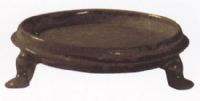 敞口,圓唇,直頸,淺腹,平底微凹,三蹄足。器外壁施青釉,硯面微凸,露胎,釉色青中泛黃,胎壁厚薄均勻,釉層光澤度好,透明度高,胎釉結(jié)合緊密。刻劃同心弦紋兩道。肩部飾弦紋一道。此器造型規(guī)整,為早期的青瓷的成功作品。