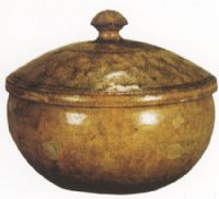 器身燮滿、渾圓,蓋面飾雨道弦紋,頂置蘑菇形鈕。全器施釉,色里米黃色,均勻潤澤,有冰裂紋。蓋、身扣合緊密。雖造型簡單,但製作規(guī)整,精緻,為西晉青瓷的典型作品。釉面部分剝落。