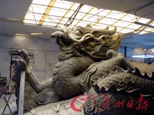 在雕刻過程中,還有一段趣聞,由于巨龍的造型是盤身昂首,而且身下還有一個(gè)一米高的屋頂,這樣整個(gè)巨龍初稿就有4米多高,超過工場(chǎng)的高度。無奈之下,楊銳華只好將龍頭上端的10多平方米工場(chǎng)棚頂揭開,讓龍頭“喘氣”,同時(shí)為了不讓龍頭淋雨,揭開棚頂?shù)牟糠钟种匦律w上更高的棚頂。