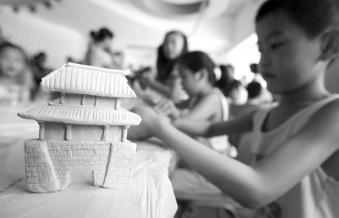 在專業(yè)老師的指導(dǎo)下,孩子們制作黃鶴樓、起義門等武昌景點(diǎn)的縮微陶瓷版。第一次接觸陶藝,不少孩子難免手忙腳亂。