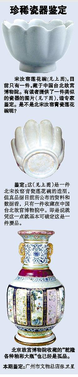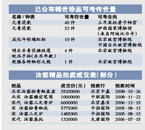 瓷器中有個(gè)別品種已被學(xué)術(shù)界確認(rèn)為孤品,以北宋汝窯青瓷蓮花碗為例,據(jù)可查資料,目前僅有一件存于中國臺(tái)北故宮博物院中。在市場上流通的汝窯瓷器并不多,而且均以天價(jià)成交。如在2008年以3520萬元成交的北宋汝窯粉青釉蓋盒、2008年拍出1000萬元的北宋汝窯鏤空筆筒。其他汝窯瓷器動(dòng)輒以數(shù)百萬元價(jià)格成交。連清乾隆、雍正時(shí)期仿制的汝窯瓷器也可拍出100萬元以上價(jià)格。