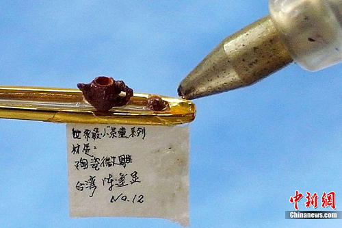 臺(tái)灣著名微雕家陳逢顯近日以微塑完成兩件可置于針孔上的陶瓷茶壺,堪稱(chēng)世界最小陶瓷茶壺。(記者 陳立宇 )