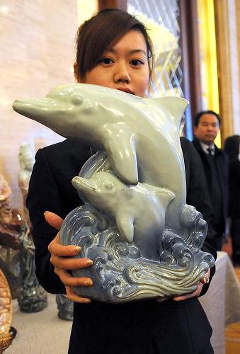 2月15日,一名工作人員在展示鄭商瓷材質(zhì)制作的2012年韓國(guó)世博會(huì)吉祥物“海豚寶寶”。新華社記者 李安 攝