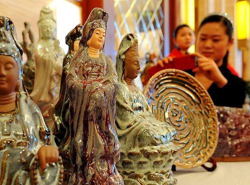 2月15日,一名參觀者在拍攝鄭商瓷作品。記者從中國(guó)貿(mào)促會(huì)獲悉,由河南省貿(mào)促會(huì)和鄭州市組織推薦的鄭商瓷作為我國(guó)陶瓷藝術(shù)類(lèi)的唯一代表參加2012年韓國(guó)麗水世博會(huì),并成為中國(guó)館全球合作伙伴。鄭商瓷由鄭州大學(xué)歷史學(xué)院教授、中國(guó)民協(xié)陶瓷專業(yè)委員會(huì)主任閻夫立在繼承商代青瓷制作工藝和吸收“五大名瓷”精華的基礎(chǔ)上發(fā)明的綠色環(huán)保新瓷種,其名取“鄭州”“商都”“瓷之國(guó)粹”的首字組成,曾作為鄭州文化品牌參加2010年上海世博會(huì)。新華社記者 李安 攝