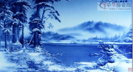 汪吟泉光影青花《獨釣寒江雪》瓷板