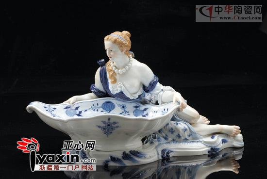 一位豐滿的婦人瓷雕,跪爬在一只巨大的青花瓷盆前,盆中青花精美,瓷色不濃不艷,純正清雅。劉剛介紹,這件是德國邁森青花瓷塑人物盆。“這和中國青花瓷為什么這么像呢?”欣賞這只德國青花瓷,記者立刻聯(lián)想到了中國的青花瓷。劉剛笑了,說:“當(dāng)時(shí)中國青花瓷對歐洲人影響力很大,在歐洲人眼里,中國青花瓷是個(gè)非常昂貴的東西,一般人買不起。因此,他們也非常迷戀,買的時(shí)候,要挑選有中國圖案的,用壞了,用金或銀來修補(bǔ)。而德國邁森瓷廠,在歐洲第一個(gè)把中國青花瓷本土化了。