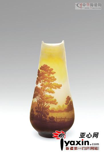 一只黃色玻璃瓶,肚大口小,瓶身上,一片空曠的草地,綠樹成蔭,婆娑起舞,散發(fā)著詩一般的浪漫氣息,這就是法國加萊白地風(fēng)景套料瓶。