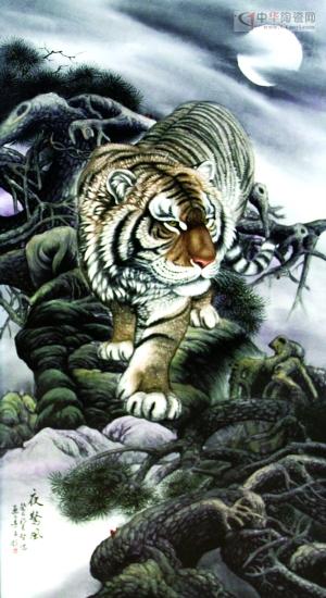 夏仁錦從事陶瓷藝術創(chuàng)作二十余年,尤其擅長動物走獸繪畫。他帶來的作品中有4幅以虎為主題的瓷板畫,通過釉上新彩的藝術陶瓷表現(xiàn)形式,刻畫出萬獸之王虎的雄風。