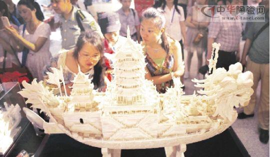 湖北展廳里,讓觀眾最感到神奇的莫過于仙桃的貝雕。這種手工藝的原材料是淡水貝殼,主要產(chǎn)自仙桃的沙湖。一件長近1米的龍船通體雪白,好像會發(fā)光,表面由很多的小方格粘結(jié)而成,但船面平整、做工細(xì)膩,傳承人徐銀枝說,“這一臺做起來要用半年,需要先把弧形的貝殼磨平,磨成各種形狀,再往一起拼接”,最難的部分就是比較細(xì)小部分的雕刻,力道的掌握要很準(zhǔn),只見龍船上房屋的鏤空花樣板由數(shù)不清的小格子組成,格子小的連大點的螞蟻都過不了。