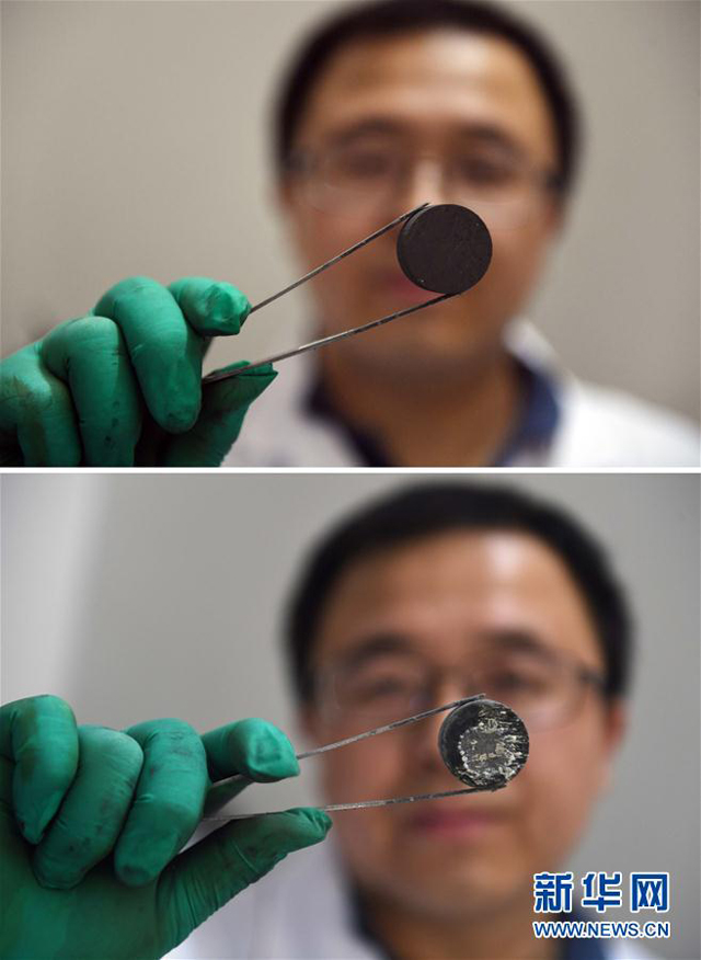 拼版照片:上圖為中南大學(xué)粉末冶金國(guó)家重點(diǎn)實(shí)驗(yàn)室研究人員在觀察灼燒實(shí)驗(yàn)前的超高溫復(fù)合材料坯體表面;下圖為研究人員在觀察灼燒實(shí)驗(yàn)后的超高溫復(fù)合材料坯體表面(9月16日攝)。記者近日從中南大學(xué)獲悉,由黃伯云院士領(lǐng)銜的中南大學(xué)粉末冶金國(guó)家重點(diǎn)實(shí)驗(yàn)室團(tuán)隊(duì),通過(guò)大量實(shí)驗(yàn)開發(fā)了一種新型的耐3000攝氏度燒蝕的陶瓷涂層及其復(fù)合材料,這一發(fā)現(xiàn)有可能為高超聲速飛行器的研制鋪平道路。9月16日,記者來(lái)到這個(gè)實(shí)驗(yàn)室,現(xiàn)場(chǎng)見(jiàn)證了科研工作者對(duì)新型超高溫復(fù)合材料坯體進(jìn)行3000攝氏度燒蝕實(shí)驗(yàn)。新華社記者 李尕 攝